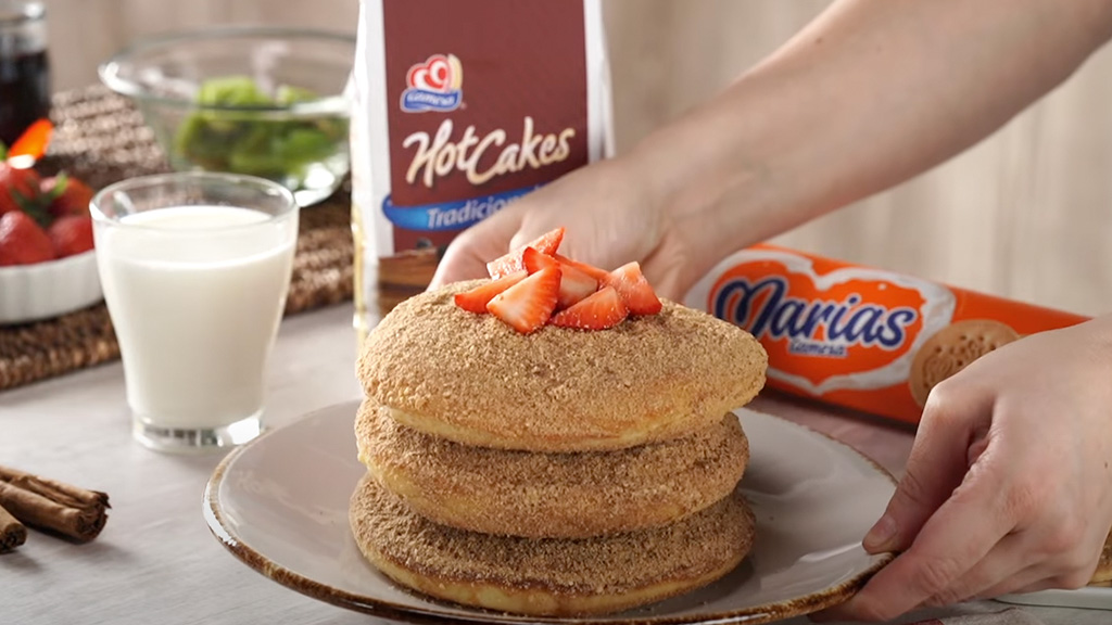 Estos hot cakes son una original mezcla que recuerda al sabor de los churros, tienen un toque de canela, azúcar y una sorpresa de Galletas Marias Gamesa ® Clásicas que los hace únicos. Fáciles de preparar, esponjosos e ideales para comenzar el día.